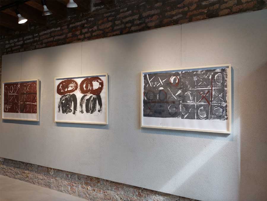 In quelli qui presentati, come in altri suoi lavori pittorici e di scultura, si intra- vede il desiderio di ripercorrere strade contenute in tutto il suo trascorso artistico, cercando continuamente nuove vie che riconducano alle origini della pittura astratta contemporanea. Mani libere e libero pensiero tesi a “ricamare” sempre nuovi universi spaziali e universi percettivi. Una forza di libertà che si propaga da questi oggetti eventuali, mai del tutto contenuti in loro stessi, ma sempre traboccanti, pregni, di qualcosa diverso dall’origine. Quel filo continuo, nutrito e affilato da continue rifusioni e ispessimenti dati dai punto-e-a-capo del suo apprendere, e del suo racconto artistico, che anche in queste opere non riesce ad allontanarsi dall’uso di simboli netti e concisi, evidentemente e profondamente necessari al suo modo di esprimersi.