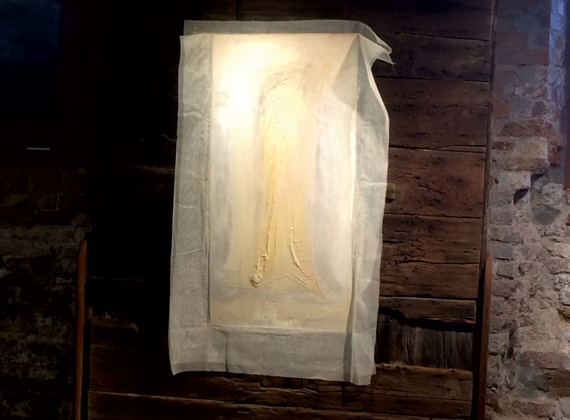 Ho pensato di chiudere questa triade espositiva ritornando nel luogo dove tutto iniziato: il luogo della ferita e della tenerezza che inganna. Ho continuato il cammino approdando nel ristoro e nella quiete delle camere dello scirocco, nella Basilica di San Celso a Milano, per terminare il mio percorso in un giardino immaginato, dove dal nero e dal bianco esplodono colori come il blue e l’oro, grazie all’uso di pigmenti puri che brillano come lampi di luce. Sarà come una danza, da me definita “danza obliqua”, che ruoterà come un vento intorno a tutti noi evitando di farci scivolare nel precipizio.