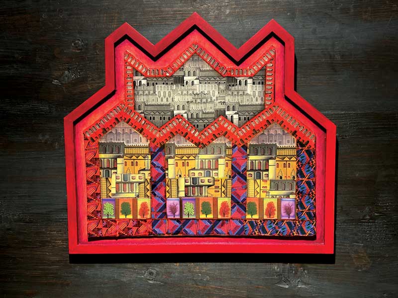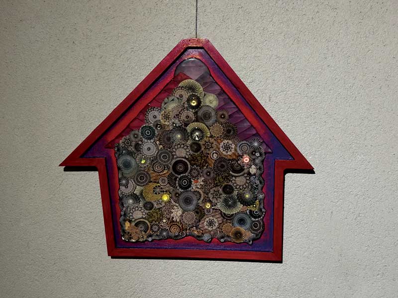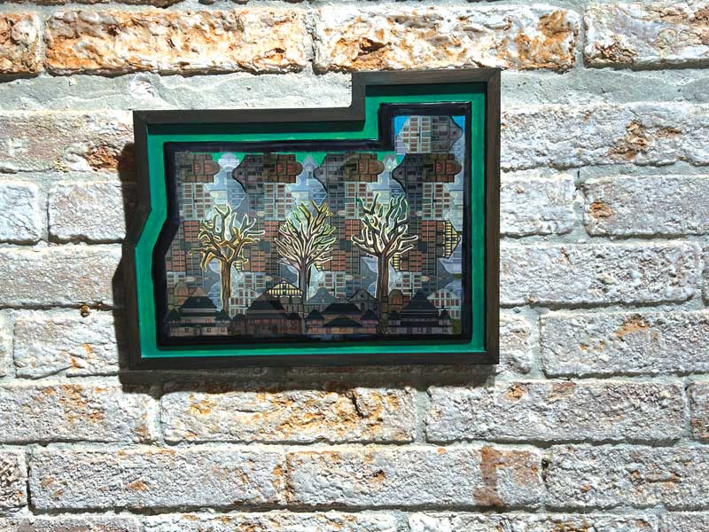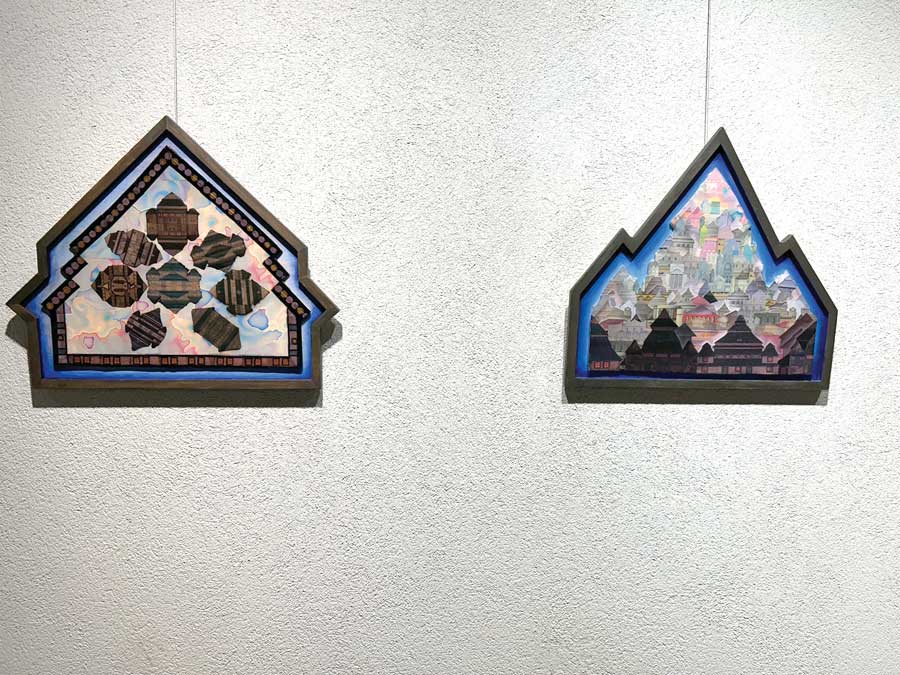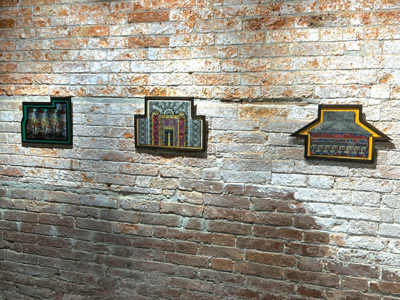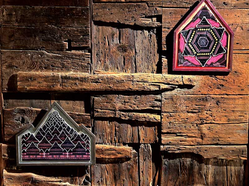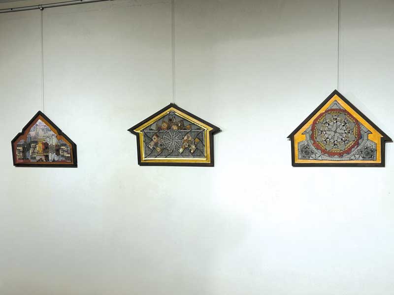 La tecnica è quella del collage o meglio del riassemblaggio di immagini tratte da cartoline, brochure e cataloghi delle sue mostre passate realizzate dagli anni ’70 a oggi. Questa modalità creativa, in altre occasioni utilizzata per creare opere e installazioni site specific astratte (vedi le mostre RE-ARRANGEMENT in New Mexico e Milano, 2023) crea un’idea di continuità e compresenza tra passato e futuro.
