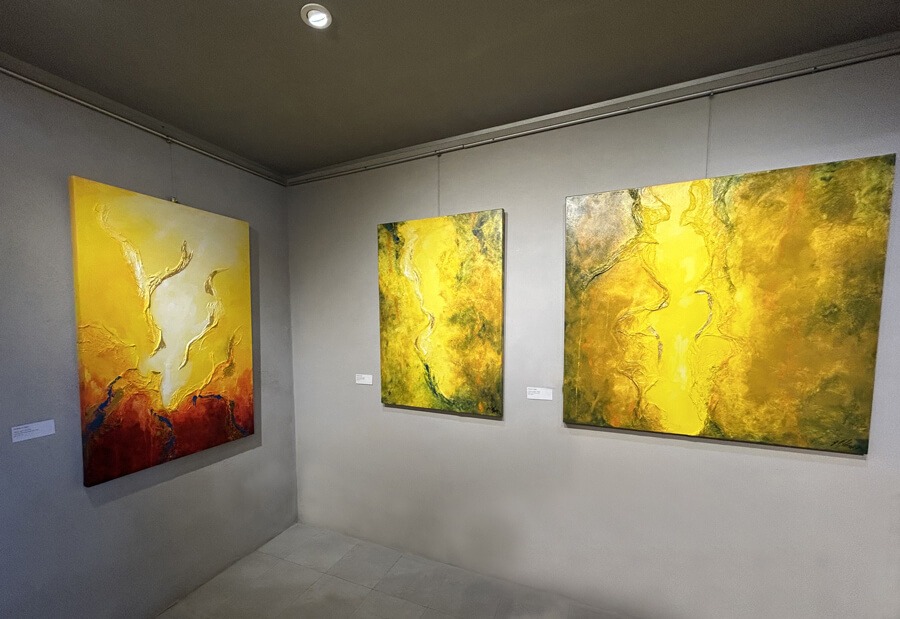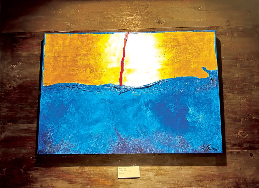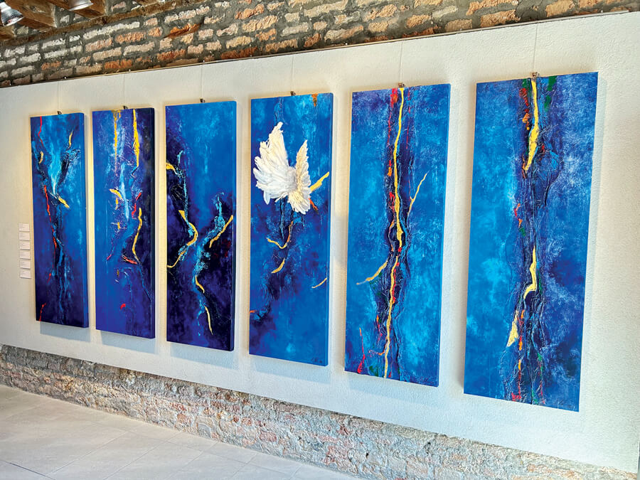 Un ritorno alle origini, quello di Li Vigni, anche nella scelta dello spagnolo «per ripartire dal paese – continua la curatrice – che per primo ha forgiato, con le sue luci, le distese d’acqua, i paesaggi rigogliosi, il senso del colore connaturato in quest’artista. Immagini che insieme compongono una “tavolozza” a cui Li Vigni attinge da sempre e continua a farlo, con rinnovato vigore». Significativa anche la scelta dell’azzurro, sul quale Daniela Pronestì aggiunge: «Ripartire dall’azzurro è come ritornare all’origine del tutto, della luce, dell’acqua, della vita stessa; risalire la corrente del tempo per andare indietro, fino all’alba del mondo, in un chiarore ancora carico di speranze, promesse, amore. Rivolgere lo sguardo verso gli spazi assoluti ed immateriali della trascendenza, e da qui ricominciare con una pittura ancora più meditata, riflessiva, “interiore”, con un’attenzione al colore che sempre più in Li Vigni assurge a tramite per trasporre sul piano visivo un intimo lavoro di “affinamento” dello spirito.
