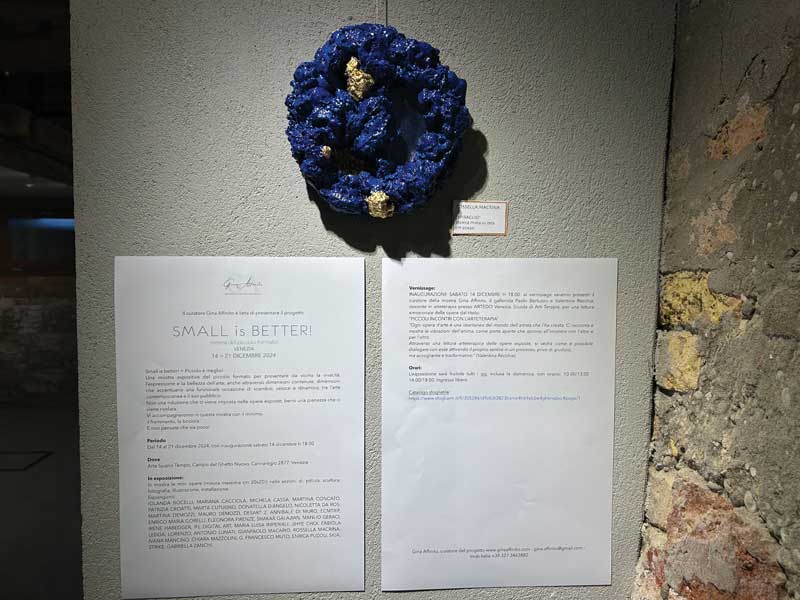Small is better! = Piccolo è meglio! Una mostra espositiva del piccolo formato per presentare da vicino la vivacità, l’espressione e la bellezza dell’arte, anche attraverso dimensioni contenute, dimensioni che accentuano una funzionale occasione di scambio, veloce e dinamico, tra l’arte contemporanea e il suo pubblico. Non una riduzione che ci viene imposta nelle opere esposte, bensì una pienezza che ci viene rivelata. Vi accompagneremo in questa mostra con il minimo, il frammento, la briciola. E non pensate che sia poco!